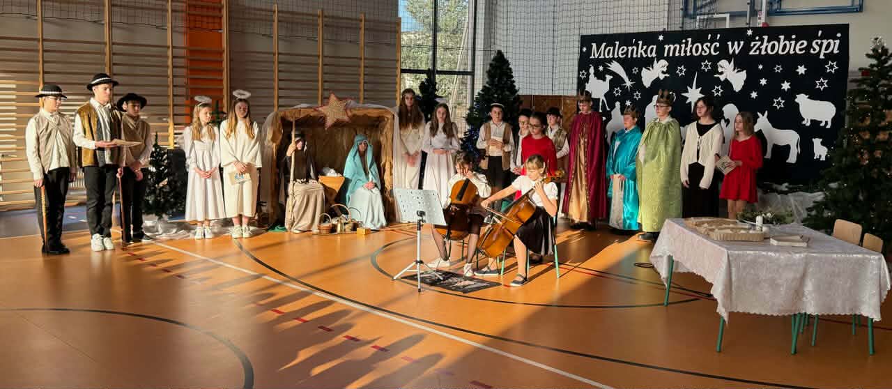 Dnia 19.12.2025 r. cała społeczność naszej szkoły przeżywała głębię nocy betlejemskiej i radość narodzin Jezusa Chrystusa z udziałem uczniów klasy V, VI i VII, którzy wystawili Jasełka Bożonarodzeniowe pod opieką nauczycieli: pani Joanny Biel, Anny Drelich, Agnieszki Lesiczki, Doroty Ruszak oraz pana Marka Wolaka.