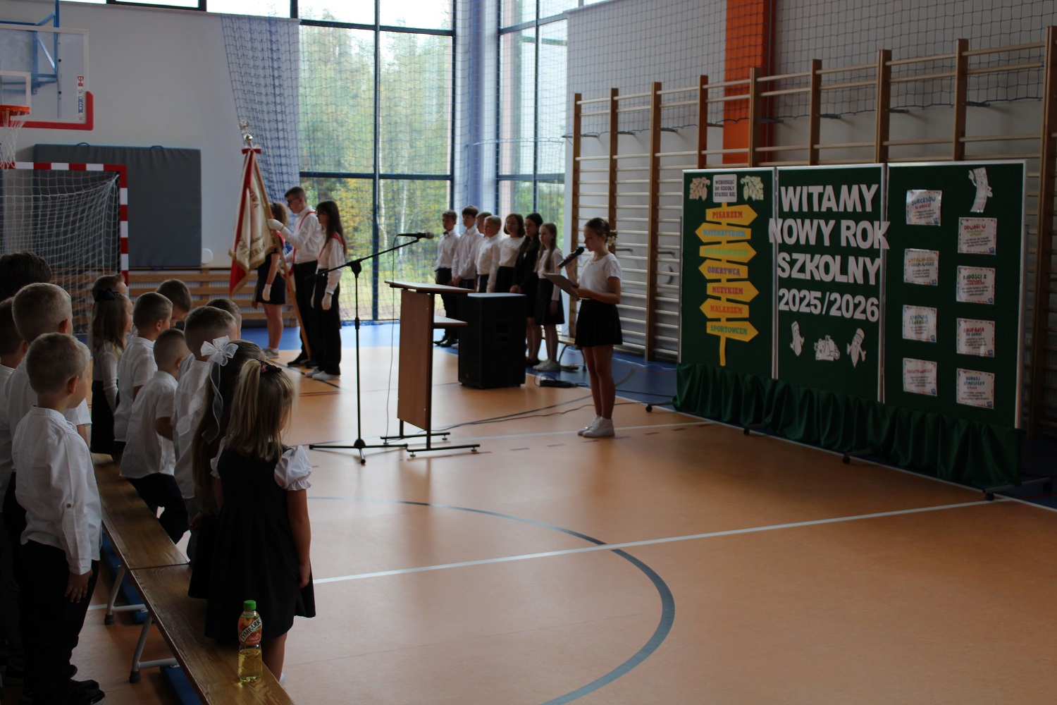 Inauguracja roku szkolnego rozpoczęła się od wprowadzenia pocztu sztandarowego i wspólnego odśpiewania hymnu narodowego. Pani dyrektor serdecznie wszystkich powitała, przedstawiła sprawy organizacyjne oraz życzenia owocnie spędzonego czasu w szkole i jak najlepszych wyników w nauce. Następnie uczniowie z klas 5 i 6 umilili uroczystość swoim występem, podczas którego zaprezentowali wiersze i piosenki związane nie tylko z pożegnaniem wakacji i powitaniem szkoły ale także nawiązujące do rocznicy wybuchu II wojny światowej.
